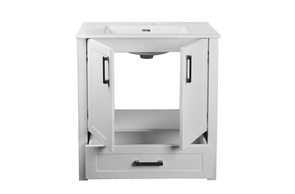 The Braylee freestanding bathroom vanity combines the clean, sharp lines of traditional design with traditional vanity styling. It features an integrated high-gloss ceramic sink with 3 pre-drilled holes for a 4″ center set faucet (faucet sold separately) and square style pulls on its doors and drawer.