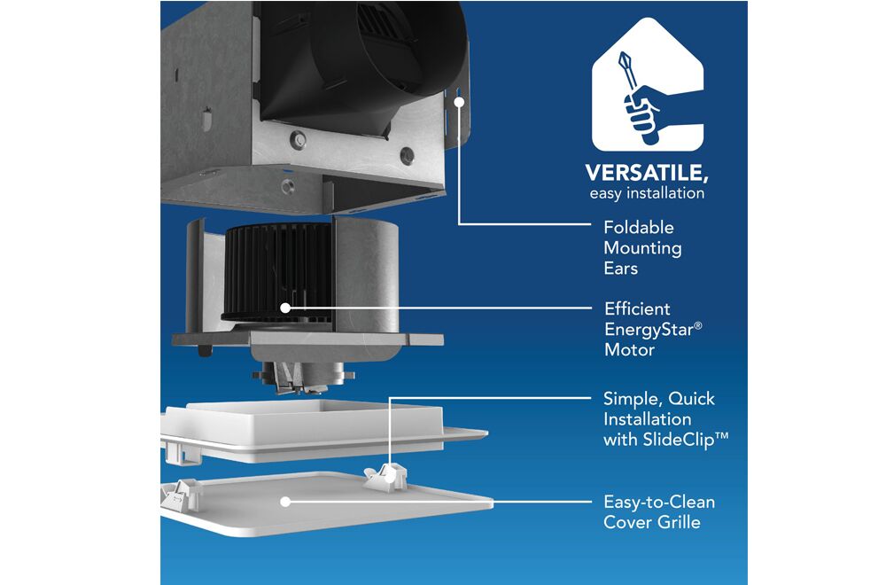 The Broan-NuTone® BE6 Roomside Series ENERGY STAR® exhaust bath fan offers fast, easy installation without attic access and no drywall cutting necessary. The design features patent pending technology with SlideClip™ grille/cover making cleaning easy with a springless attachment. The CleanCover™ grille also offers a seamless design that blends into the ceiling for a modern appearance. This series is ENERGY STAR® certified reducing energy consumption by over 50% and meeting building code requirements. All the desired features of a premium bathroom exhaust fan at an affordable price for cost-conscious, builders, contractors and DIYers. This HVI certified product has efficient performance to remove moisture, odors and pollutants to provide Better Quality of Air for Better Quality of Life.