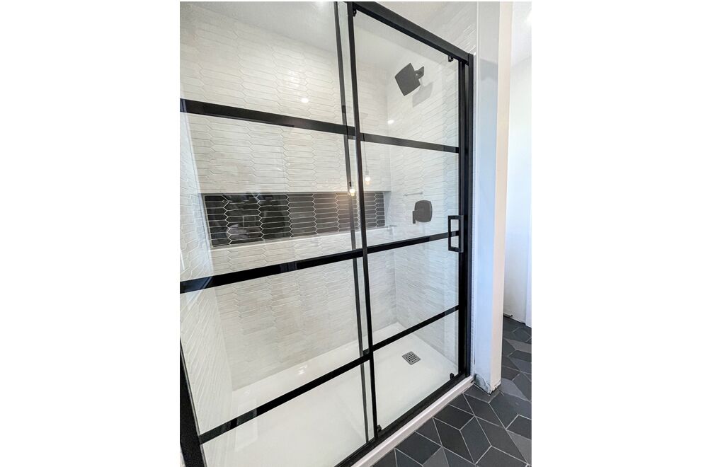Fleurco’s modern black grid patterned shower door will prove to be a favourite feature of any bathroom.