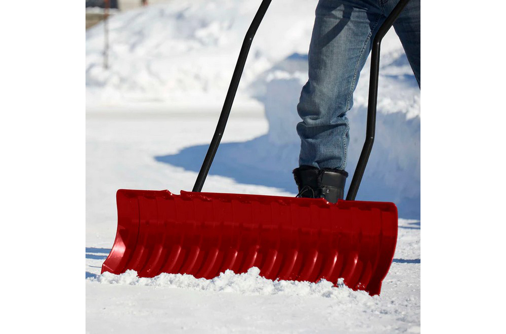 - Large handle lets you use both hands to push snow with more power