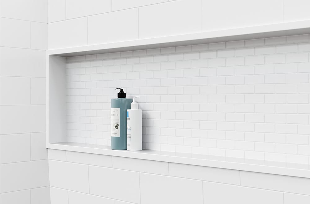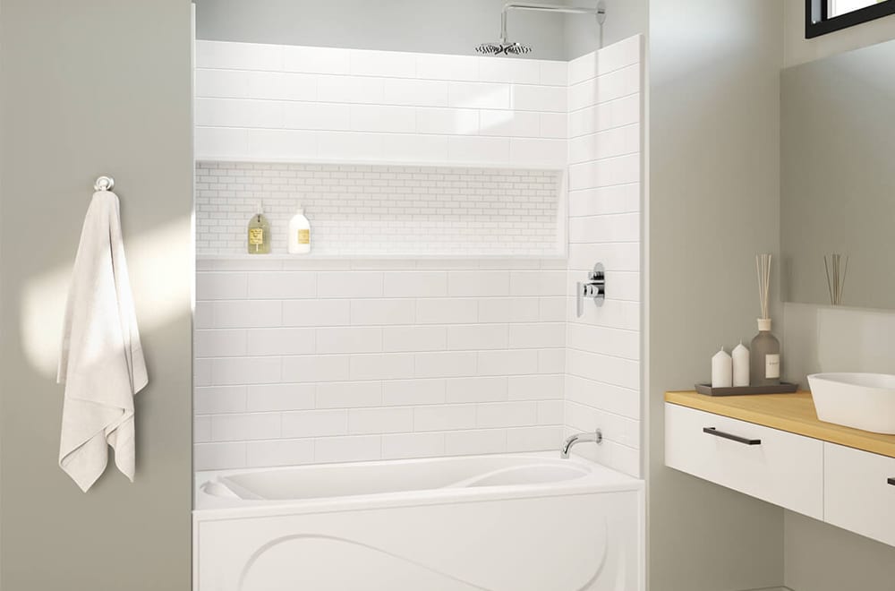 NexTile by MAAX is an innovative tub shower wall solution with a subway tile look and a built-in storage niche that installs quickly and easily by one person making it money and time saving!