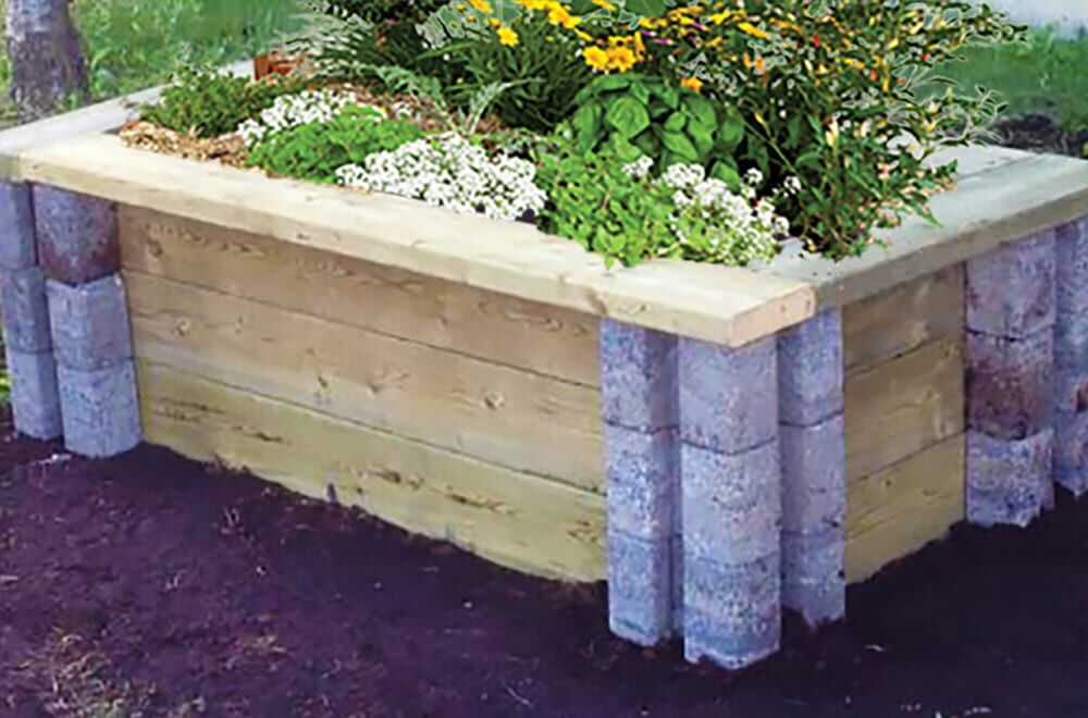 - Build in 3 easy steps: 1) Stack planter wall blocks for the framework (Use rebar or glue when going more than 1 block high; 2) Slide in 2” x 6”pieces of any kind of lumber; 3) Fill with soil and live goods