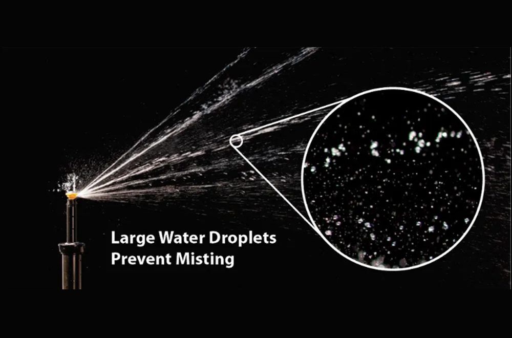- Multiple rotating streams uniformly distribute water throughout the radius range