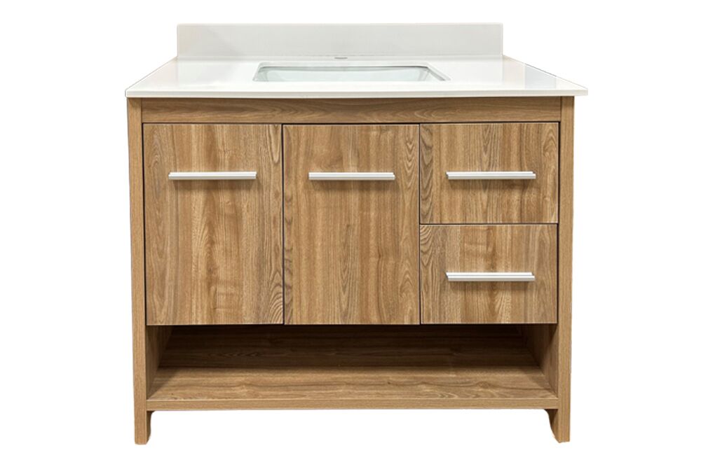 - Engineered stone counter with ceramic undermount sink