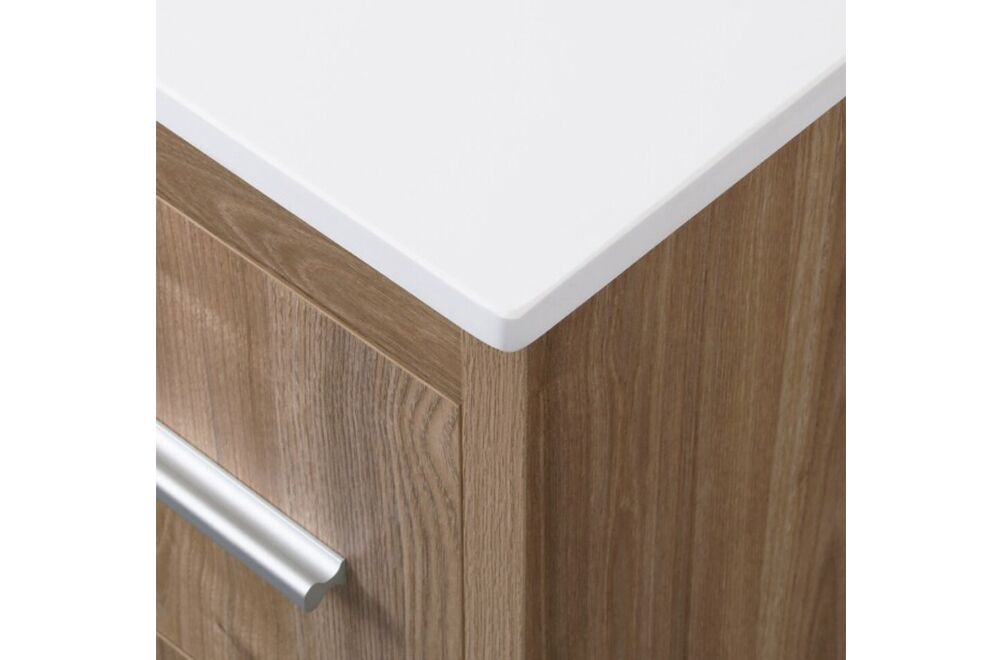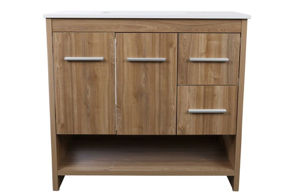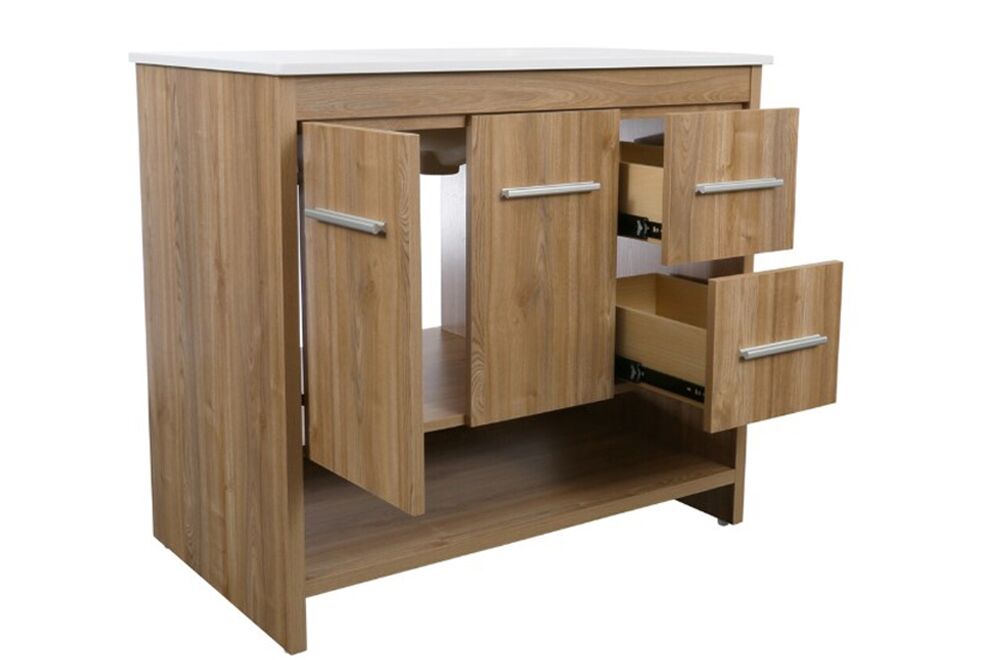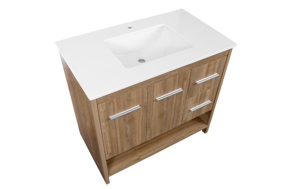The 36-inch Roma freestanding bathroom vanity combines modern elegance and practicality for your bathroom. Its durable engineered stone countertop, complete with a backsplash, pairs seamlessly with a sleek, under-mounted ceramic sink with integrated overflow, offering a clean, contemporary aesthetic. The realistic oak finish adds warmth and character, perfectly complementing the sleek lines of the design. Meanwhile, the sturdy construction ensures long-lasting performance and durability. Equipped with soft-close drawers and doors, the vanity operates smoothly and quietly, while an open bottom shelf offers convenient storage for towels and bathroom essentials. Creating a perfect blend of beauty, functionality, and thoughtful design.