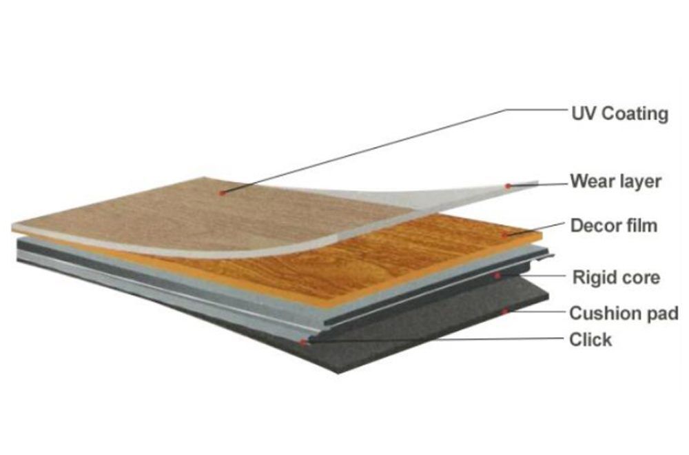 - Multi-layer SPC vinyl tile includes: cushion pad / rigid core / decor film / wear layer / and uv coating