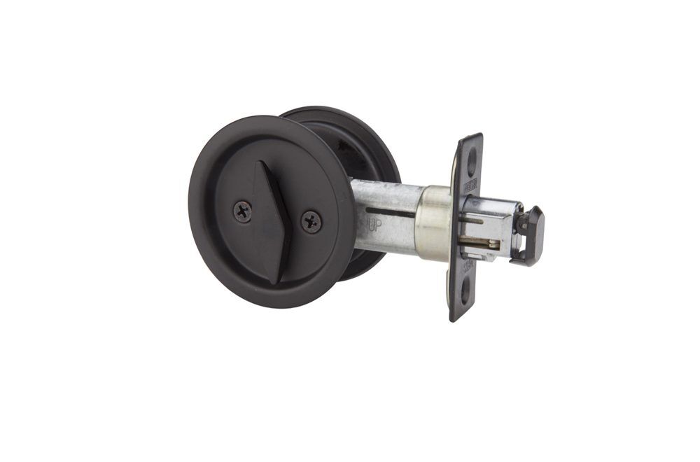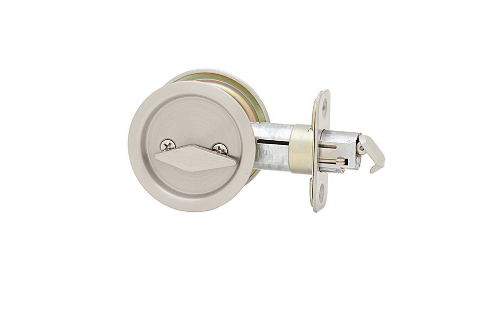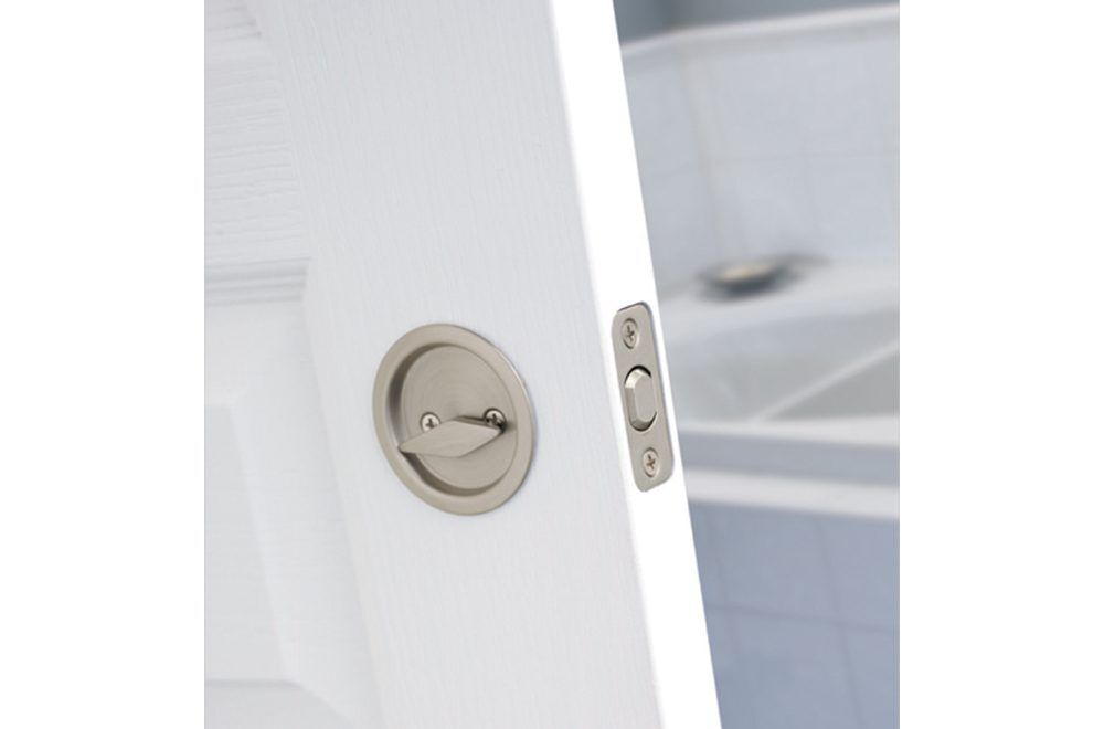 Our innovative round design fits a standard 2-1/8′ drilled door, allowing easy installation with a standard screwdriver. This privacy pocket door lock is best used in interior bed and bath applications where privacy is required.