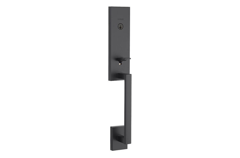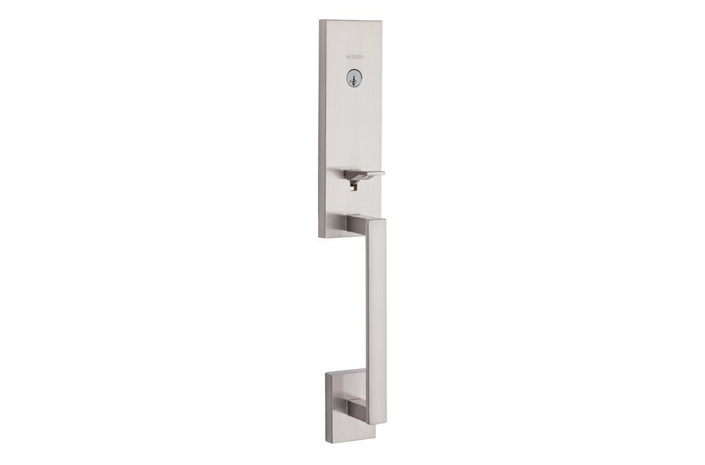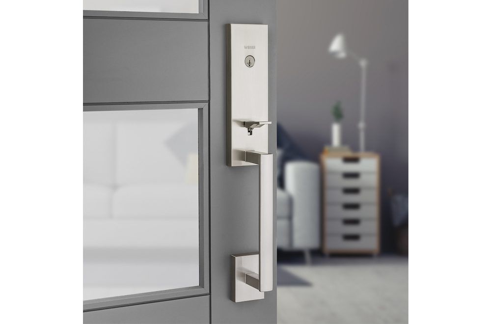 Vancouver handleset with Halifax lever. With Weiser® you can blend simplicity with elegance. The Vancouver handleset has a sleek, modern look. With clean lines and a variety of finishes, you can easily upgrade the entry to your home. Vancouver also features an adjustable screw that allows for easy door mounting and a guaranteed fit. Handleset can be locked or unlocked by a key from the outside or with a key/turnpiece from the inside.